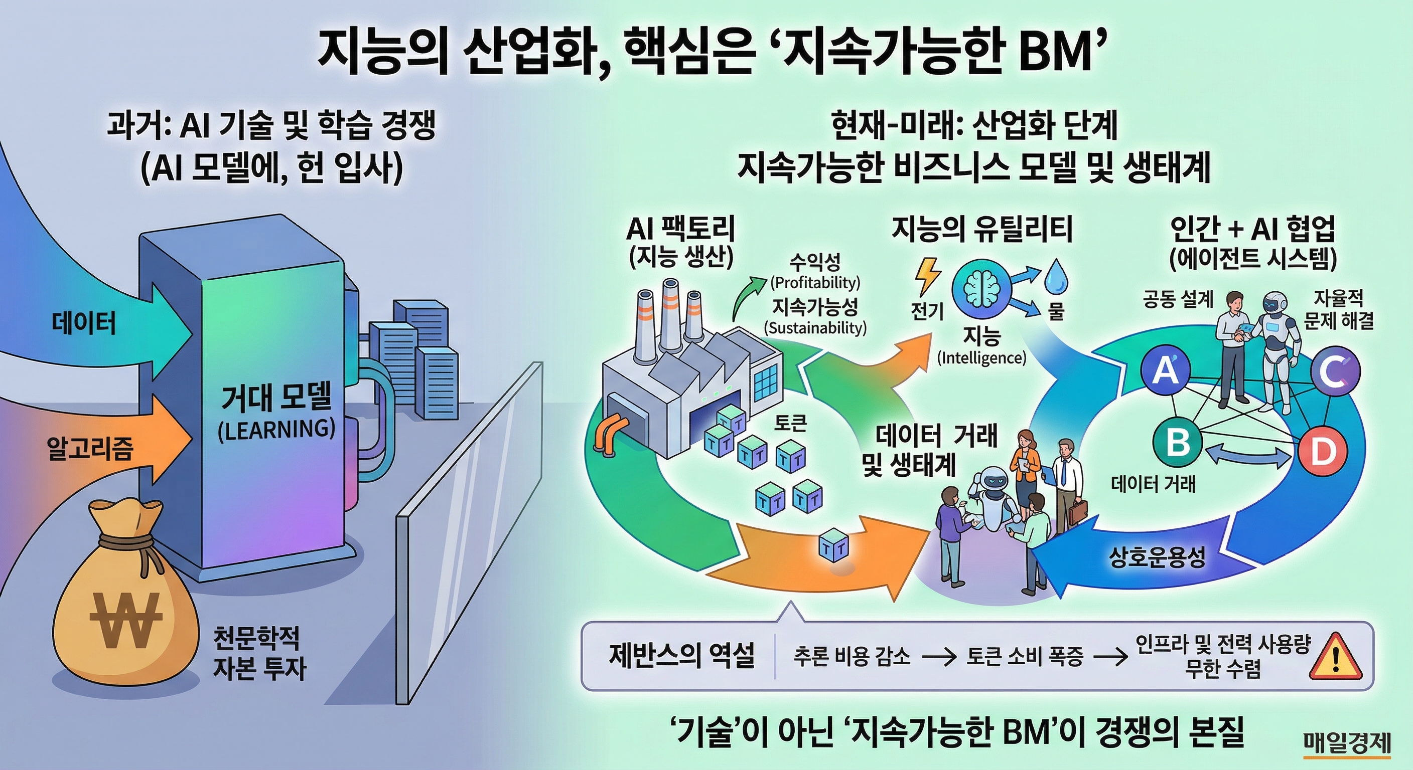 지능 공장이 위기와 기회의 복합요인인 이유는 '제번스의 역설'에서 찾을 수 있다. 추론 단가가 낮아질수록 오히려 자원 소비가 기하급수적으로 폭증하게 되는 현상이다. 인간의 지시를 기다리던 AI가 스스로 계획을 짜고 도구를 다루는 '에이전틱 시스템'으로 진화하면서, 처리해야 할 토큰량은 걷잡을 수 없이 확대된다. 기술이 고도화될수록 기업이 감당해야 할 전력과 인프라 비용 청구서는 무한대로 수렴하게 된다. 이러한 상황에서 AI를 인건비와 같은 비용 절감의 수단으로 활용할 수는 없다. 기업과 정부 모두 단기적인 효율화 도구가 아닌 본질적인 혁신의 도구로 바라봐야 한다는 의미다.